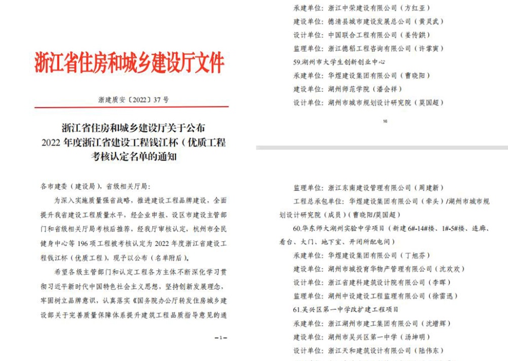 近日,浙江省住房和城鄉(xiāng)建設(shè)廳公布了2022年度浙江省建設(shè)工程錢江杯(優(yōu)質(zhì)工程)考核認(rèn)定名單,我公司承建的“華東師大湖州實(shí)驗(yàn)中學(xué)項(xiàng)目”、“湖州市大學(xué)生創(chuàng)新創(chuàng)業(yè)中心項(xiàng)目”,榮獲2022年度浙江省建設(shè)工程錢江杯(優(yōu)質(zhì)工程)。